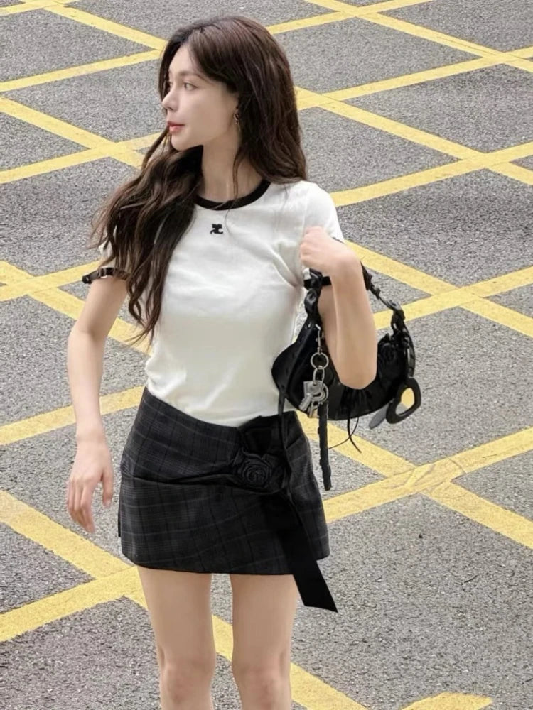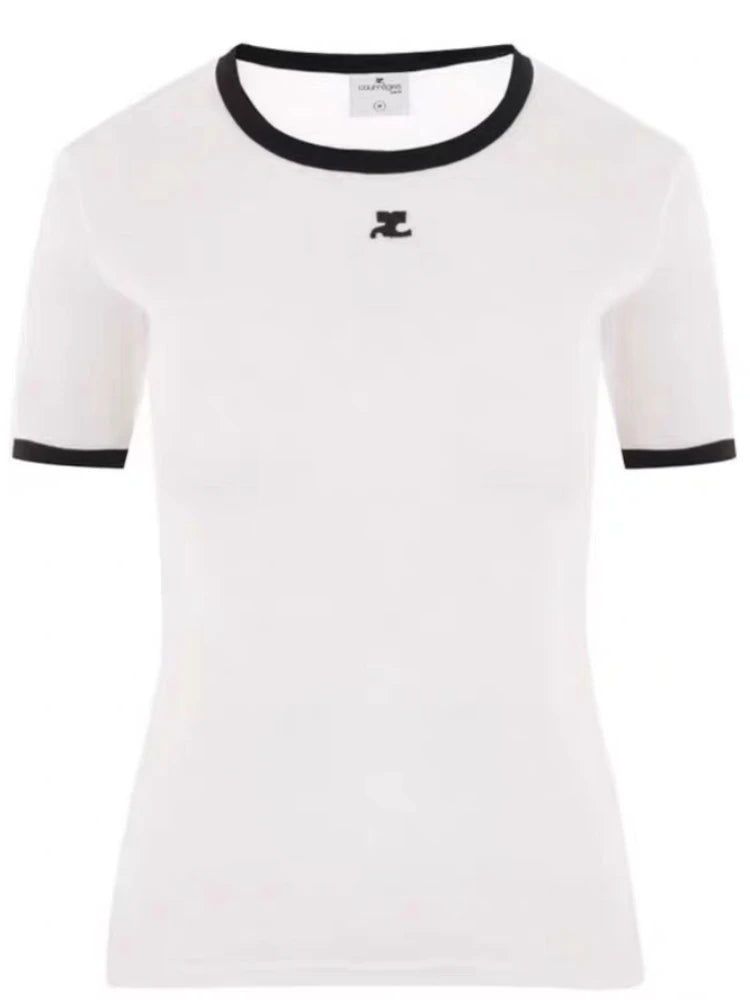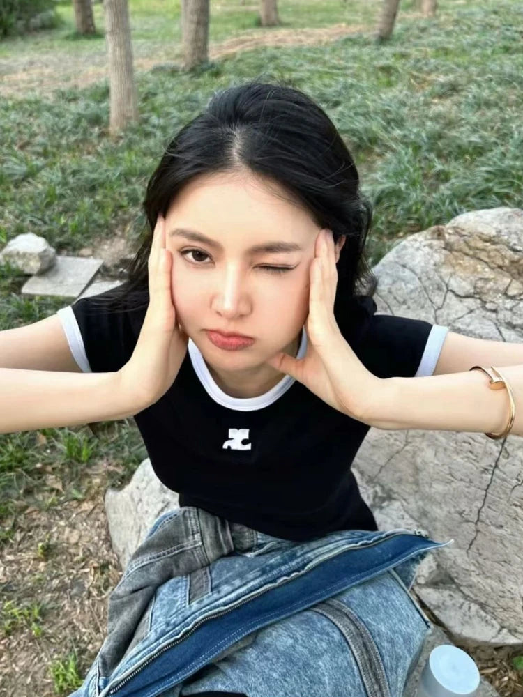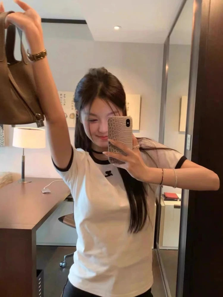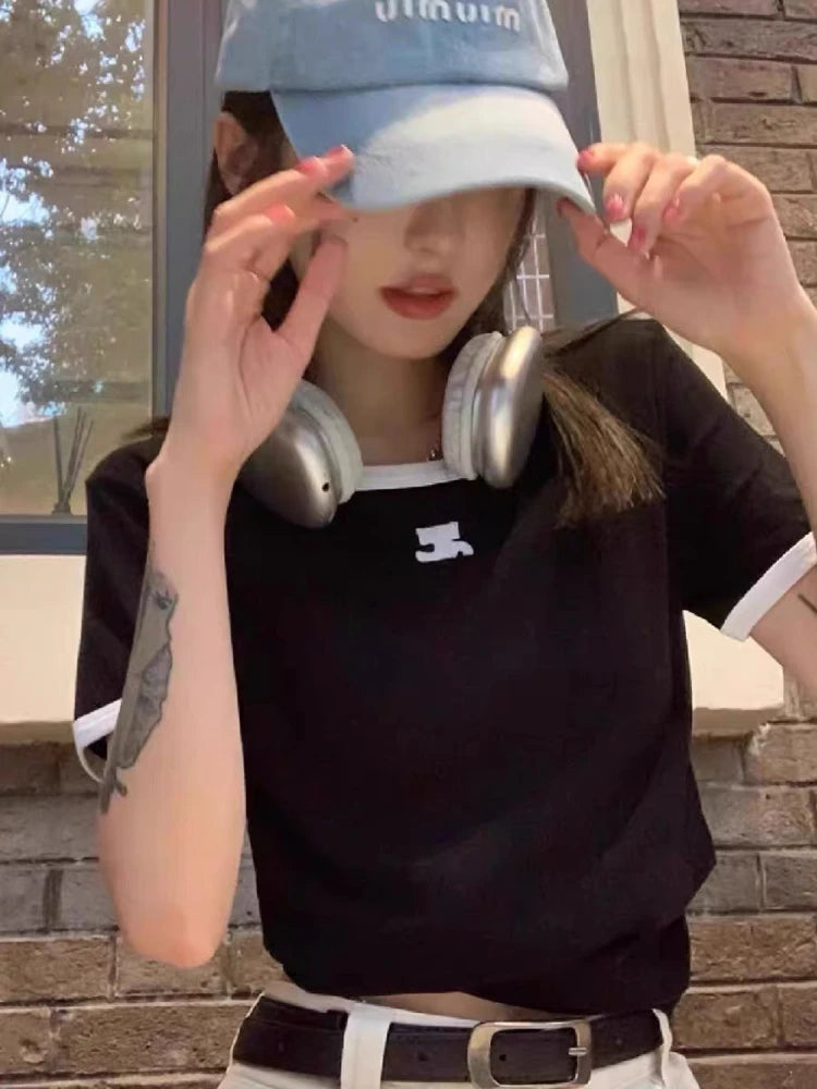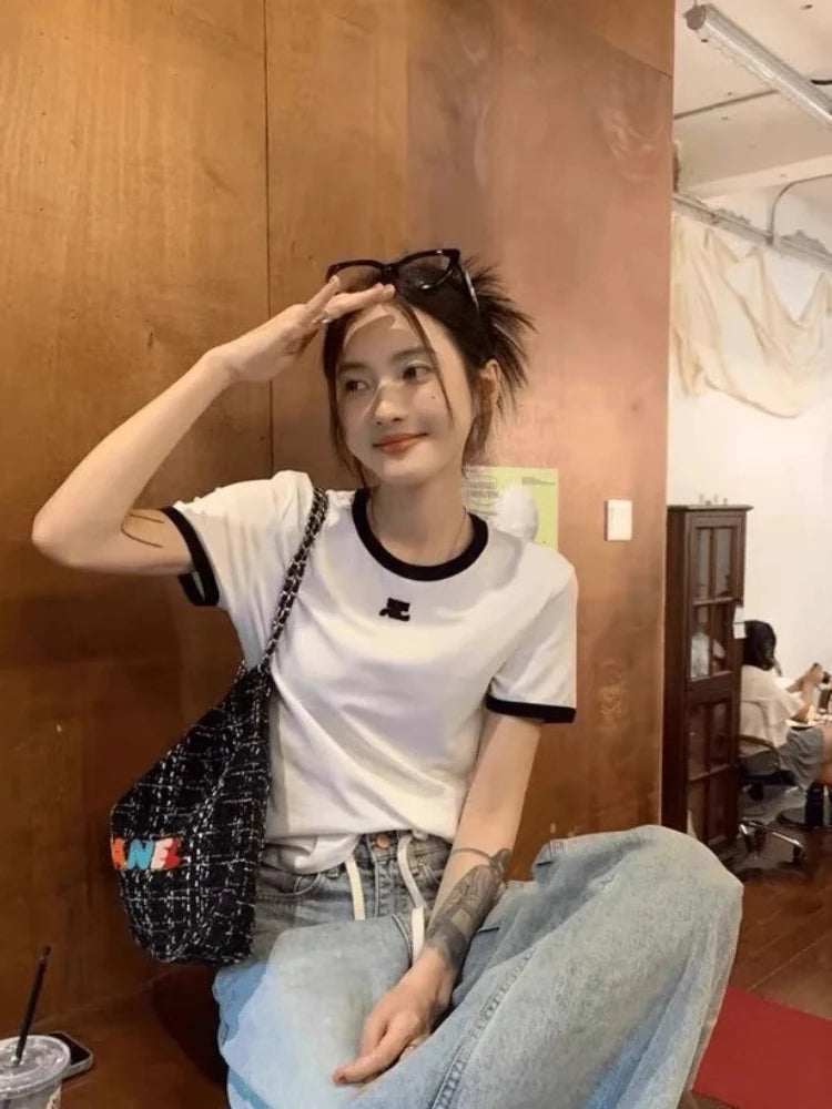 American Retro Short Sleeve T-shirt Women Streetwear Slim Fit Casual Embroidery Print Top Y2k Lady Korean Fashion Summer Clothes